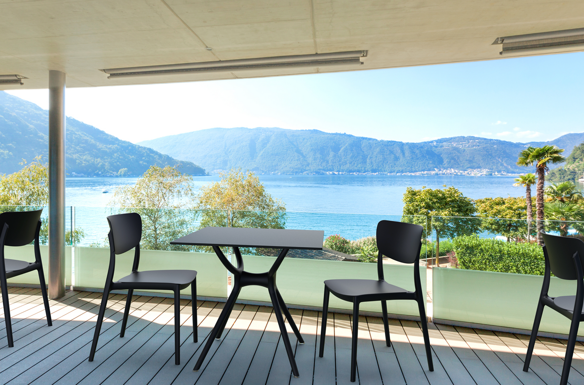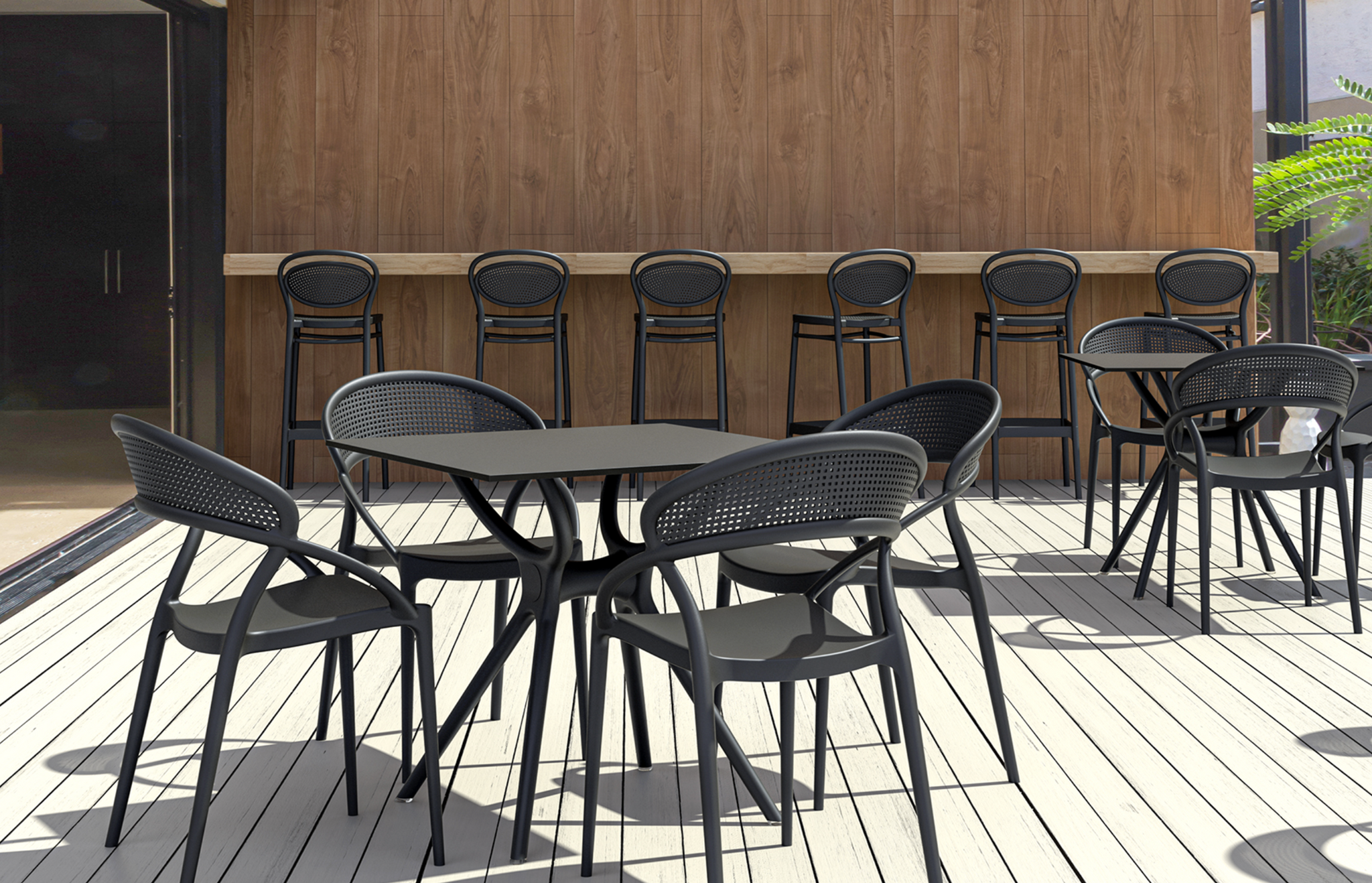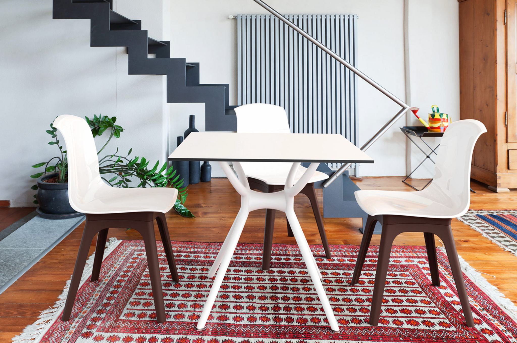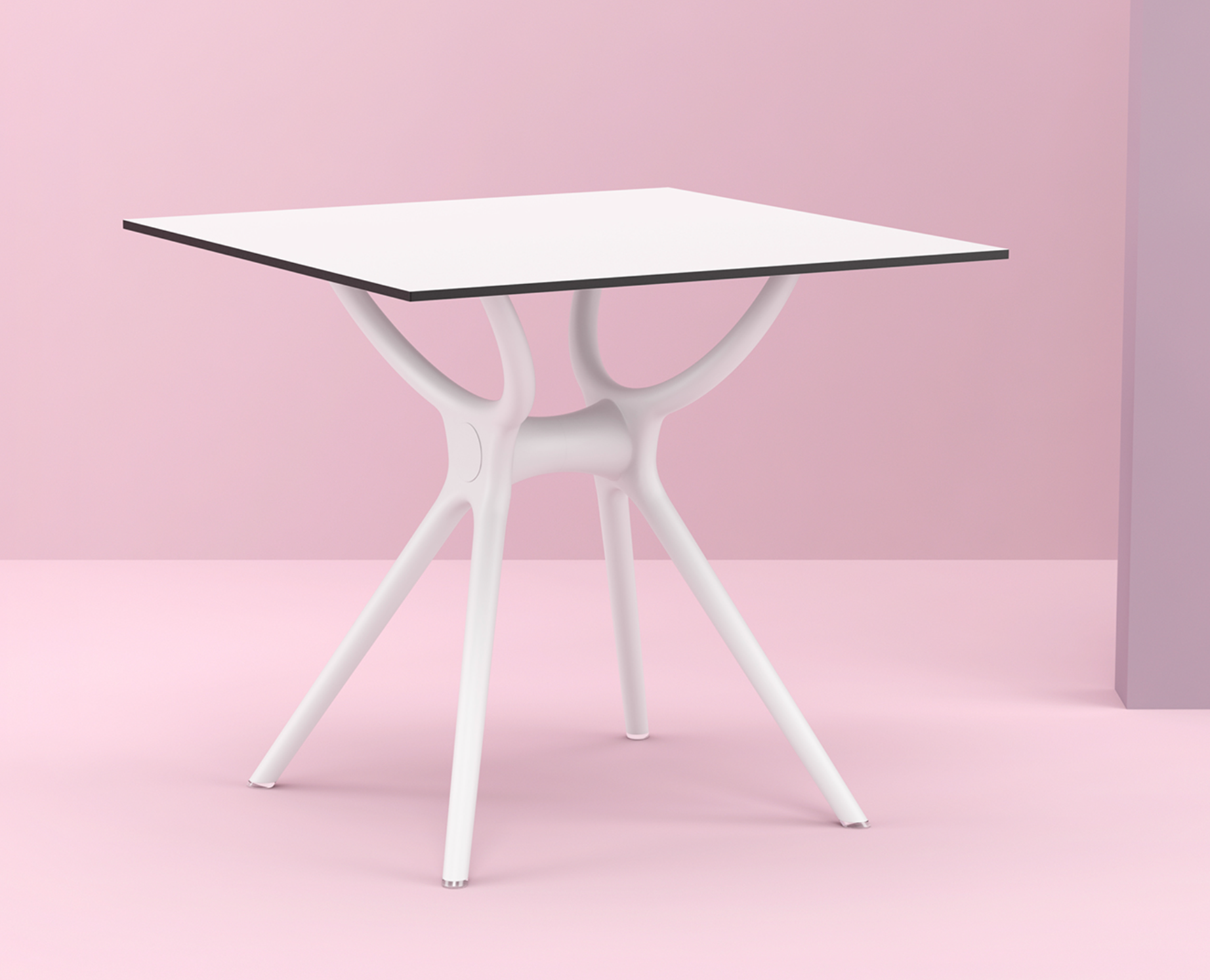 Mesa con patas de plástico y tablero en laminado compacto HPL de 12 mm disponible en color blanco y negro. Para uso interior y exterior. Desmontable.