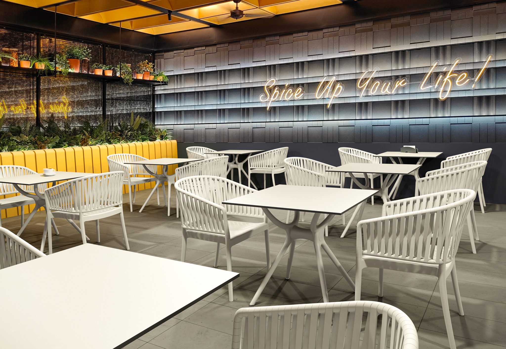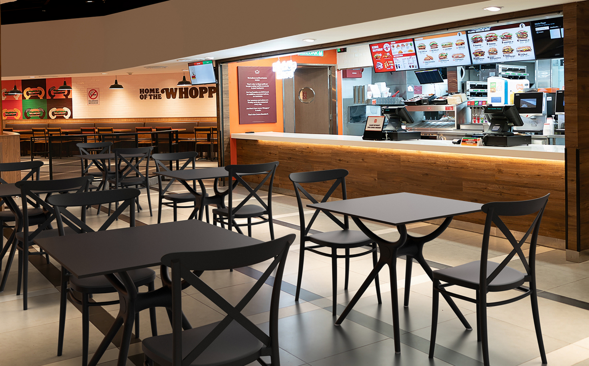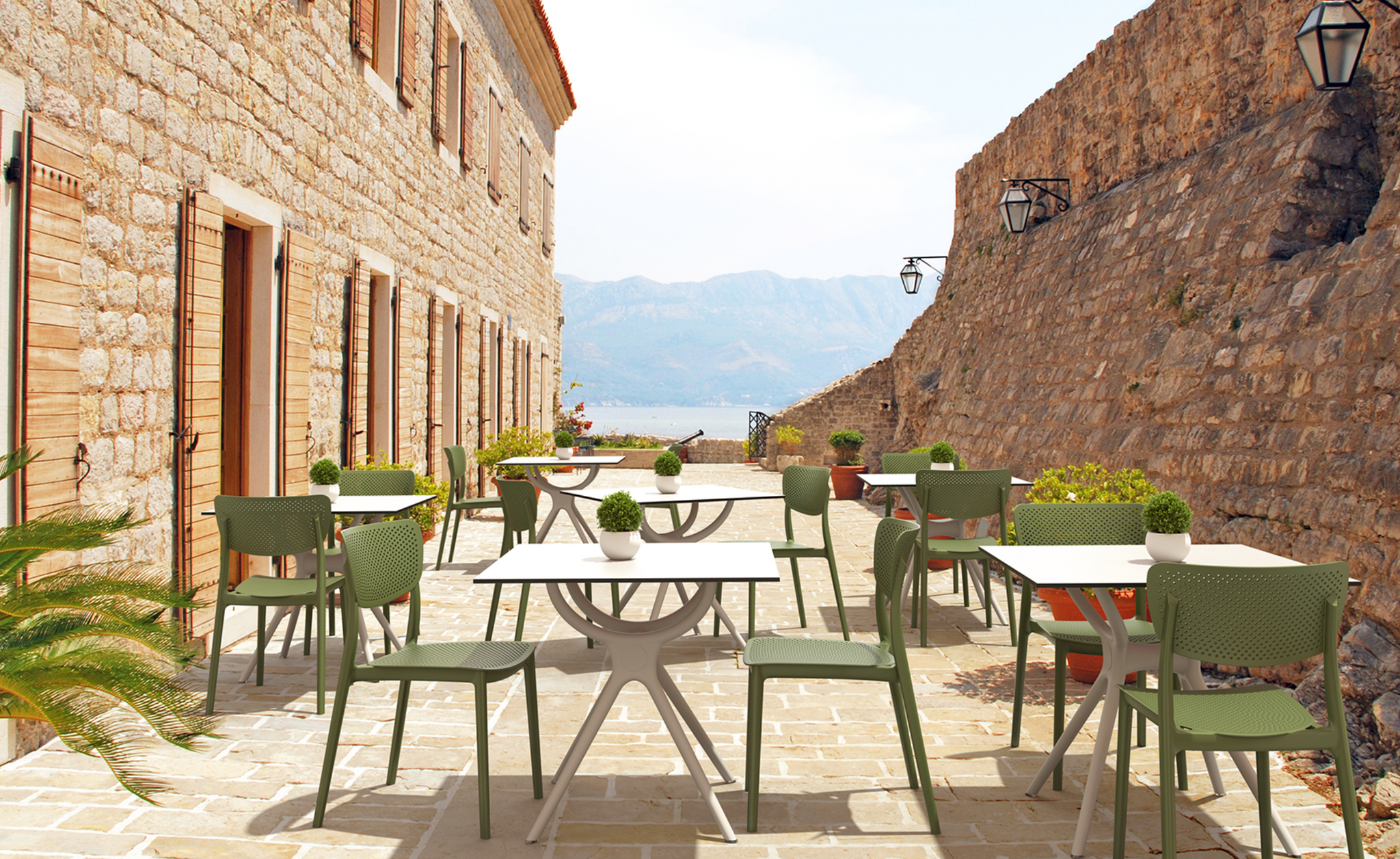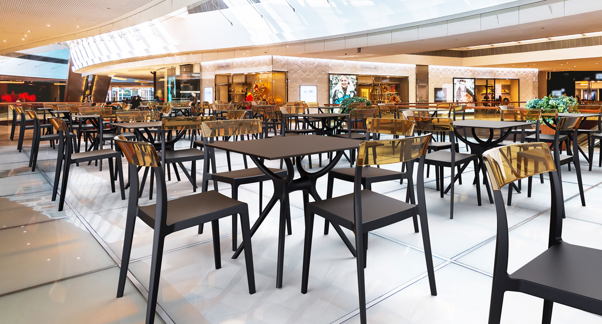 Mesa con patas de plástico y tablero en laminado compacto HPL de 12 mm disponible en color blanco y negro. Para uso interior y exterior. Desmontable.