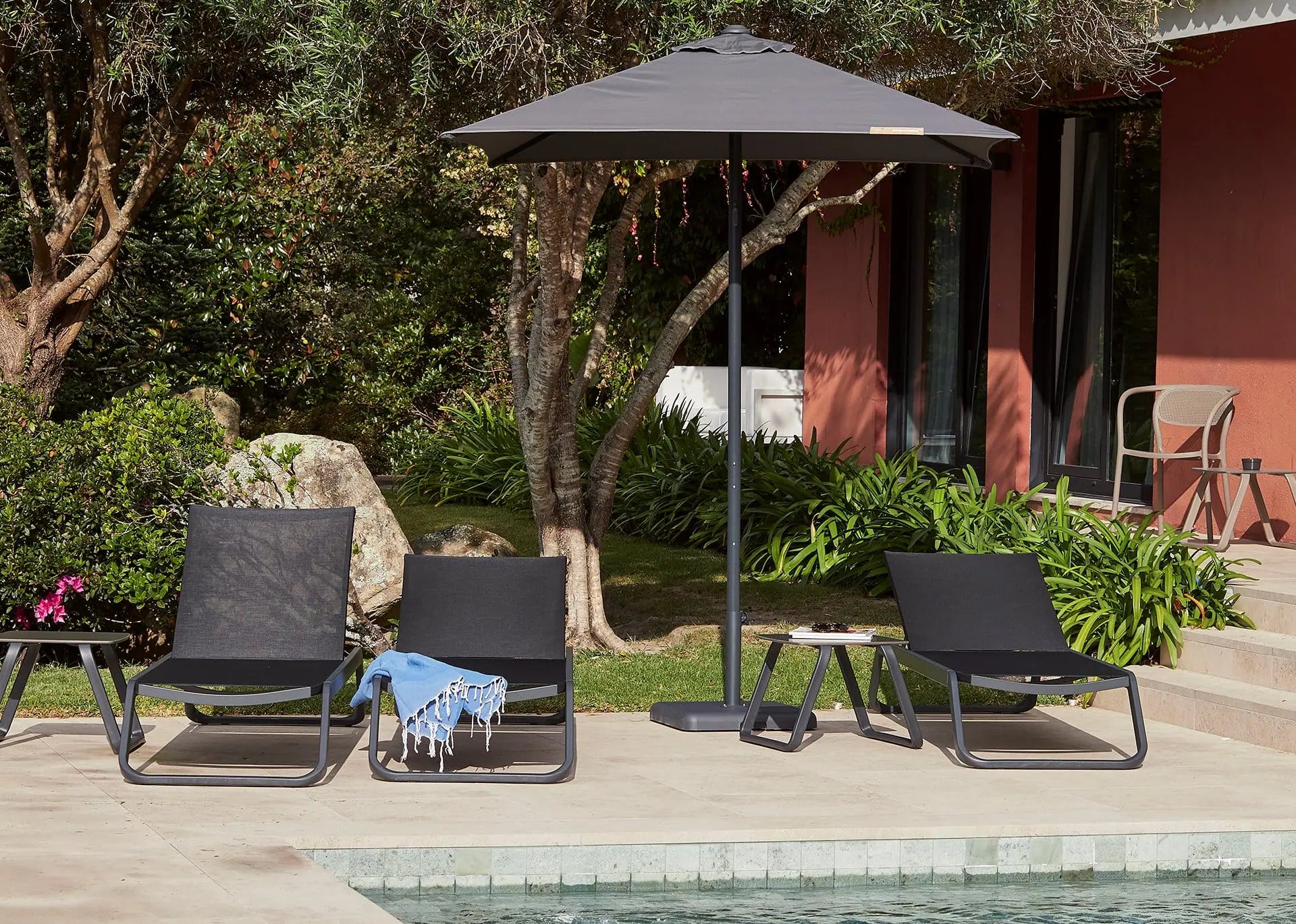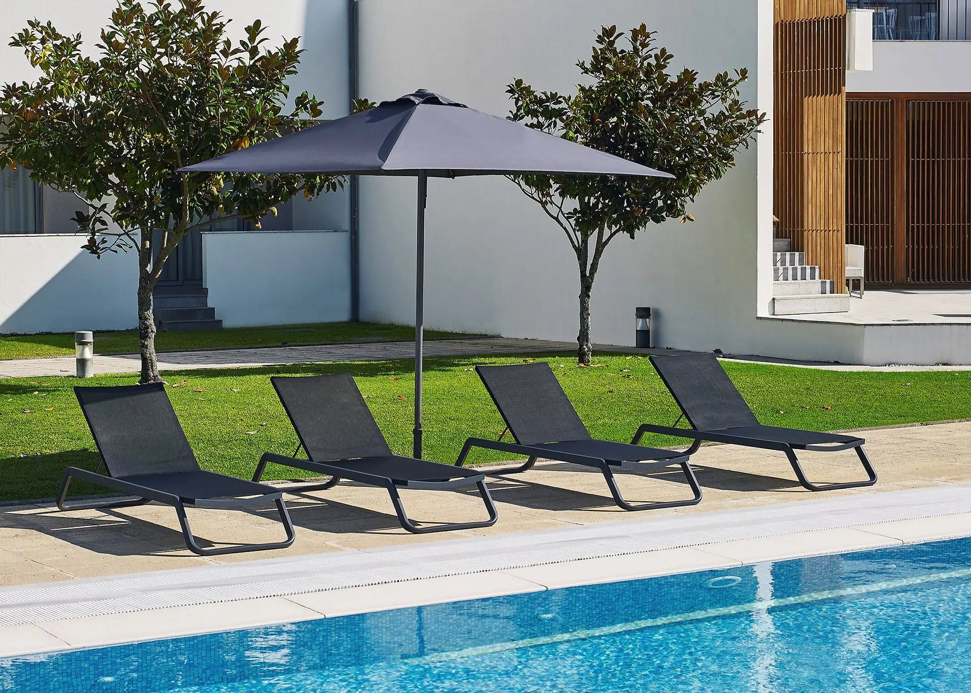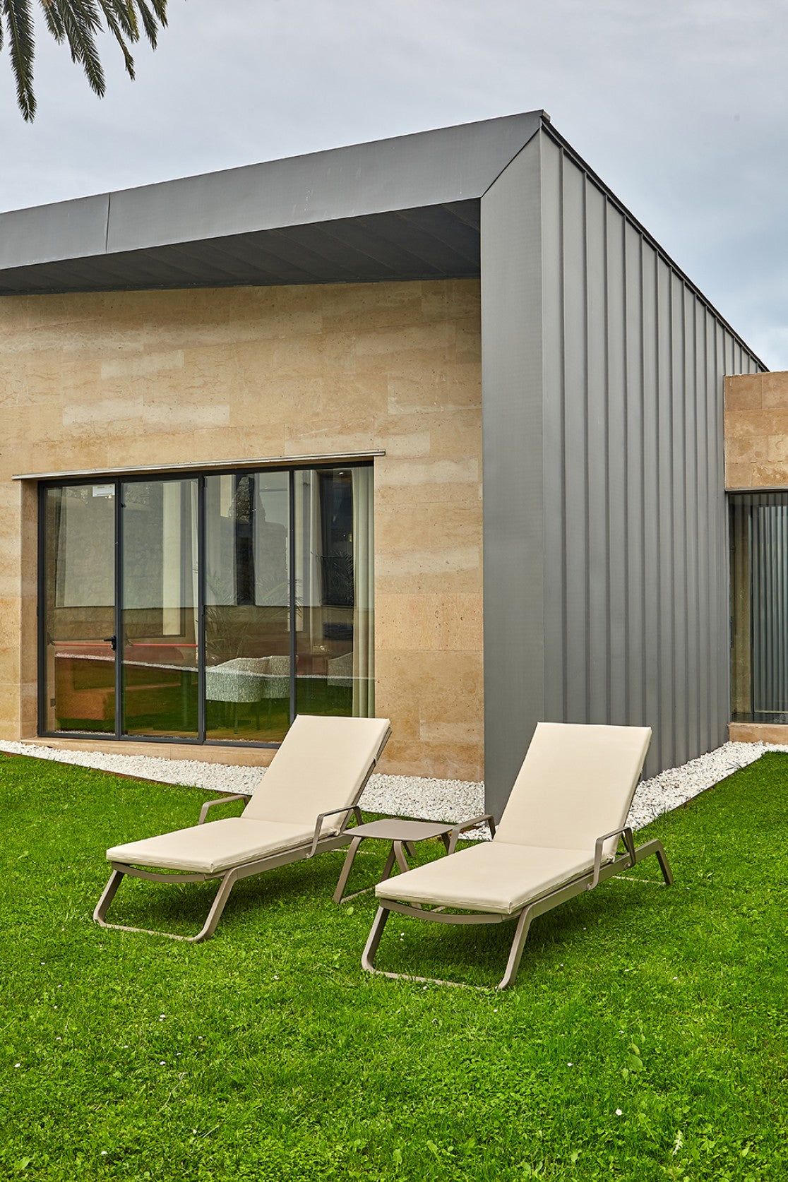 Estructura de polipropileno reforzado con fibra de vidrio. Textilene 850 gr/m2, termosoldado para mayor resistencia. Reclinable en 5 posiciones, incluyendo posición extraplana ideal para estar tumbado boca abajo. Respaldo con tope de seguridad. Ruedas en patas traseras y tacos antideslizantes en las delanteras y traseras. Peso neto 13,7 kg.