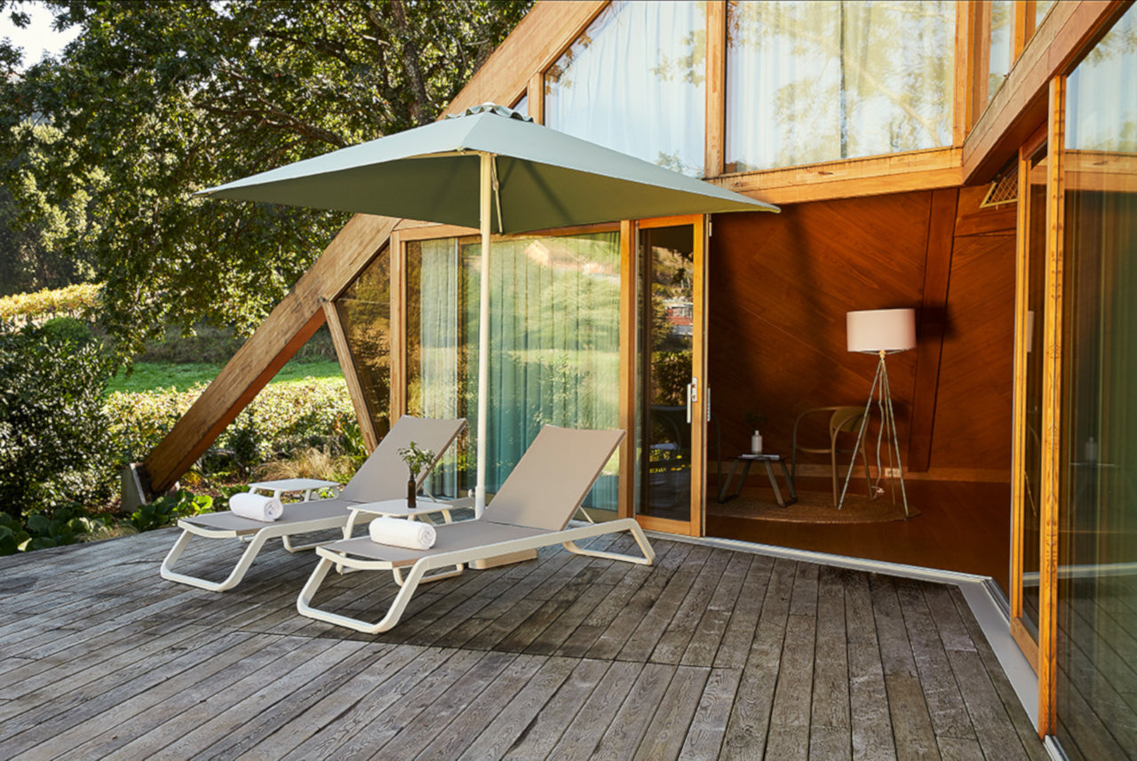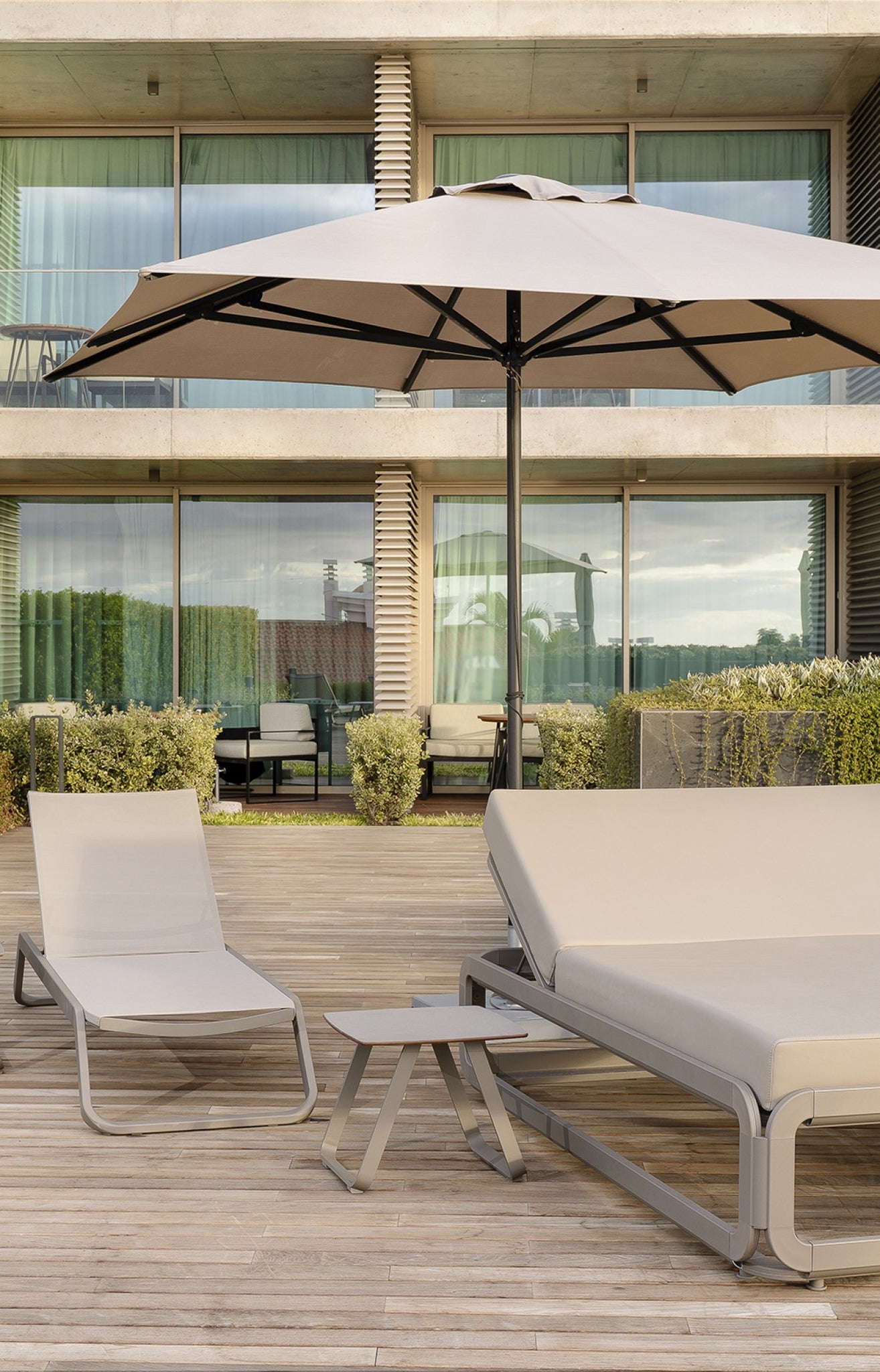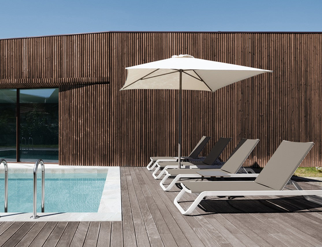 Estructura de polipropileno reforzado con fibra de vidrio. Textilene 850 gr/m2, termosoldado para mayor resistencia. Reclinable en 5 posiciones, incluyendo posición extraplana ideal para estar tumbado boca abajo. Respaldo con tope de seguridad. Ruedas en patas traseras y tacos antideslizantes en las delanteras y traseras. Peso neto 13,7 kg.