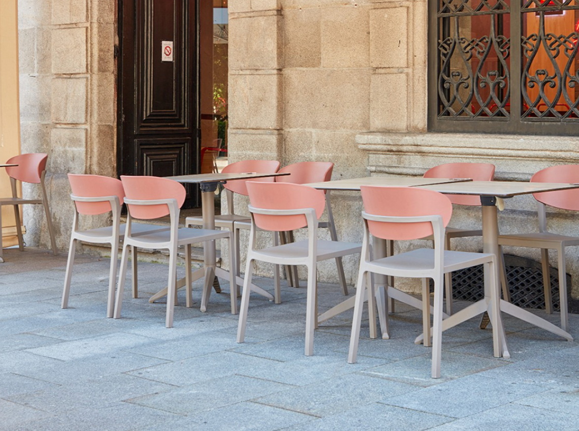 Silla apilable. Polipropileno reforzado por fibra de vidrio. Inyección por gas. Tacos antideslizantes. Ideal para uso en exterior. Protección contra rayos UV. Producto de uso público y doméstico. Usar en superficies estables y planas. Limpiar con agua jabonosa. Evite productos de limpieza agresivos.